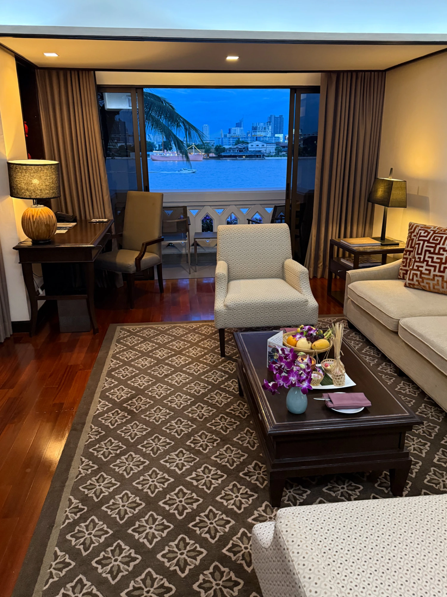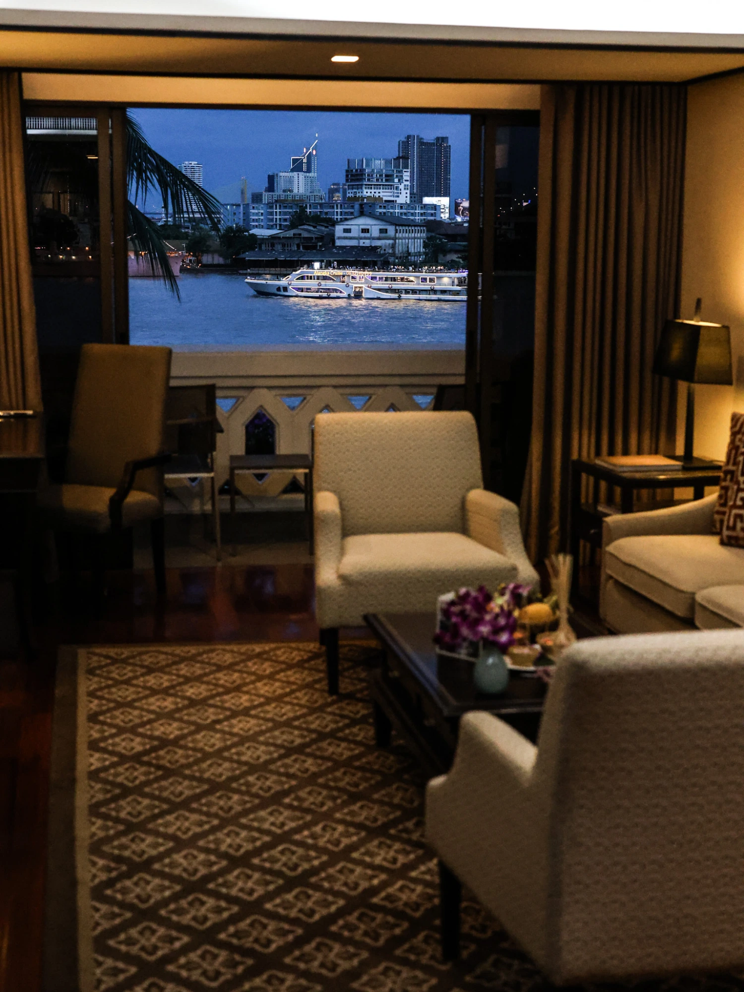Ehkä upeinta tässä huoneessa oli koko kulmahuoneistoa kiertävä ulkoterassi, jossa sai istua iltaisin katselemassa ohi lipuvia jokilaivoja. Voin kertoa, että auringon laskeutuessa tunnelma oli maaginen, kun jokialueen valaistukset syttyivät yksi toisensa jälkeen ja joen yöelämä pikkuhiljaa heräili täyteen loistoonsa. Näkymän terassilta oli fantastiset.