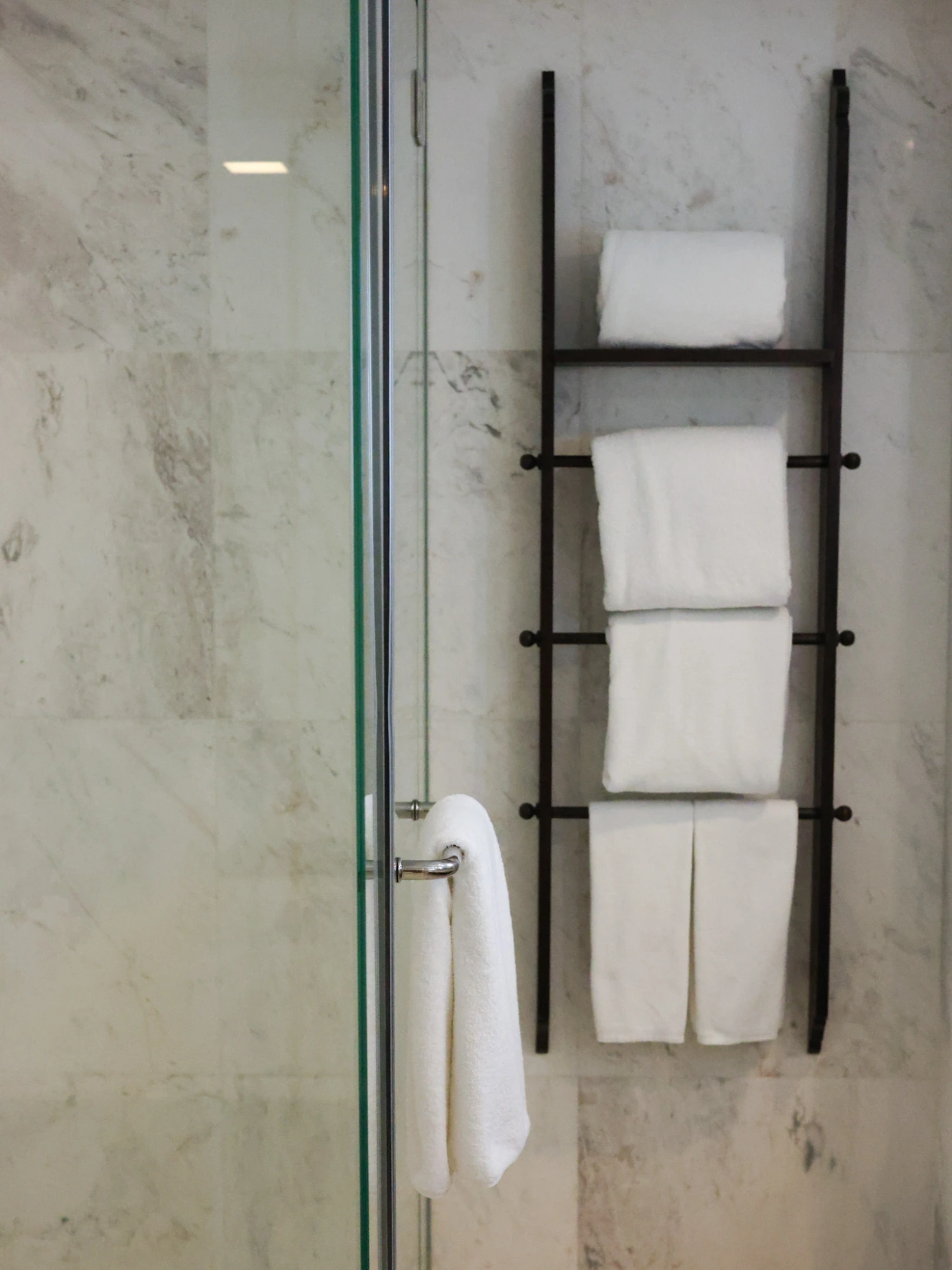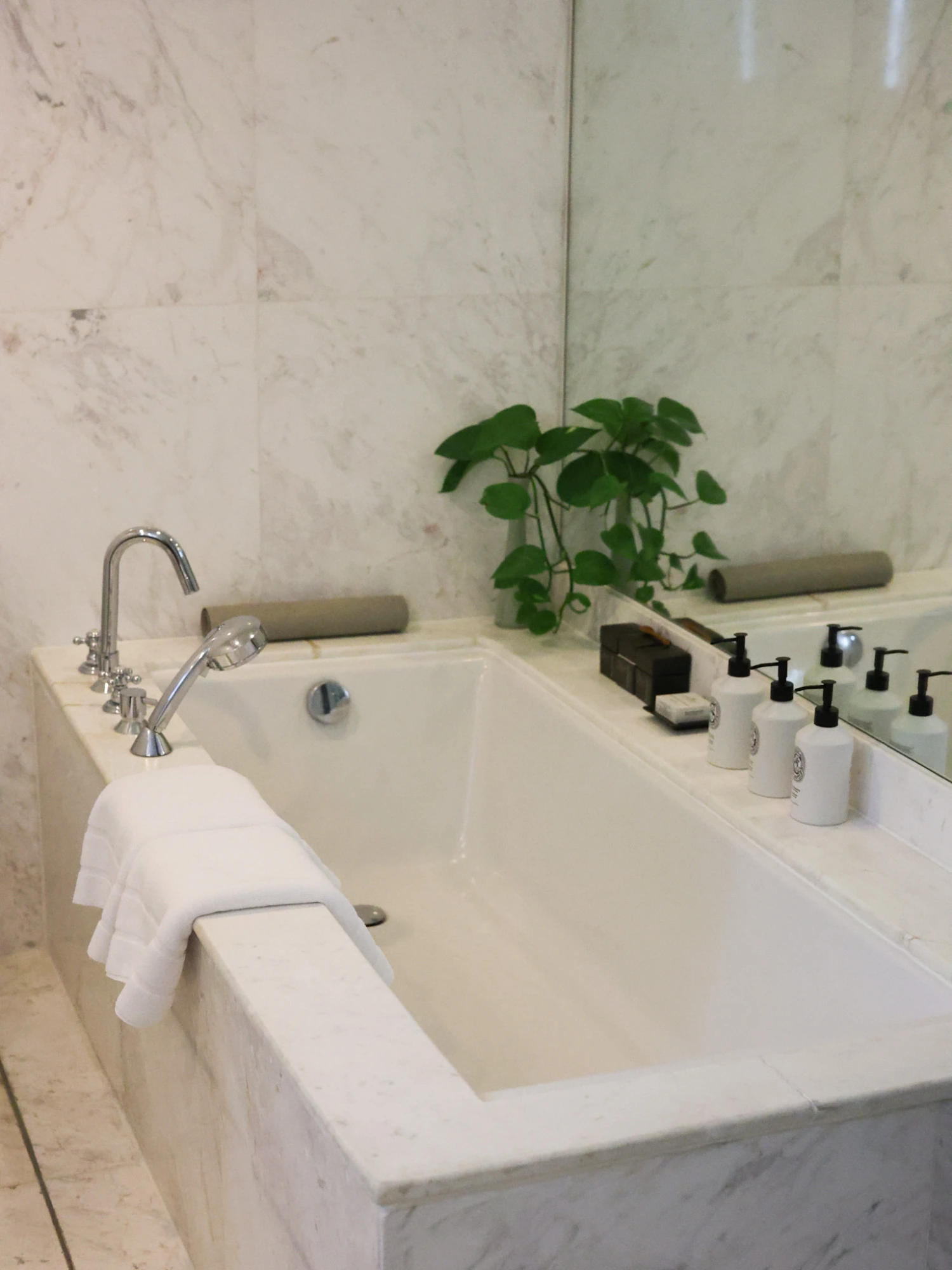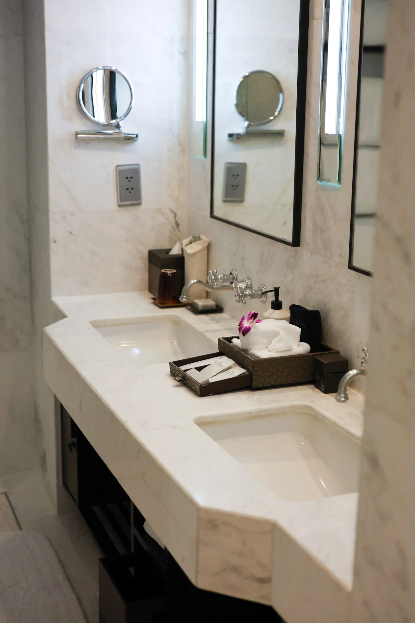 Erikoisuutena huoneessa oli myös minibaari, jossa oli oma viinikaappi! Ei siis mitään pikkolo-pulloja, vaan täysikokoisia pulloja laadukasta samppanjaa ja viinejä. Kylpyhuone oli myös valtava, josta löytyi suihkun lisäksi todella tilava amme – ja ehkä se paras kahden naisen matkustamiseen: kaksi pesuallasta ja koko seinän valtaava peili. Täällä viihtyi.