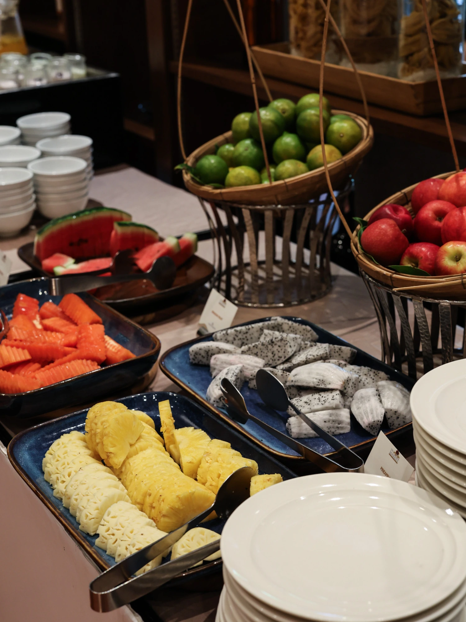 Aamiainen on yksi Anantaran ylpeydenaiheista, eikä suotta. Valikoima oli valtava. Kuten aasialaisissa viiden tähden hotelleissa usein onkin, sieltä löytyy jokaiselle kansallisuudelle jotain. Meille länsimaalaisille ehkä ne tärkeimmät on hedelmävalikoima ja munapiste. Ja ehkäpä myös leipomotuotteet. Voin kertoa, että ne olivat kaikki täysin kohdallaan tässä hotellissa. Kahvi on myös suomalaiselle tärkeää, ja se oli myös todella hyvä – ja tarjoiltiin tilauksesta pöytään.