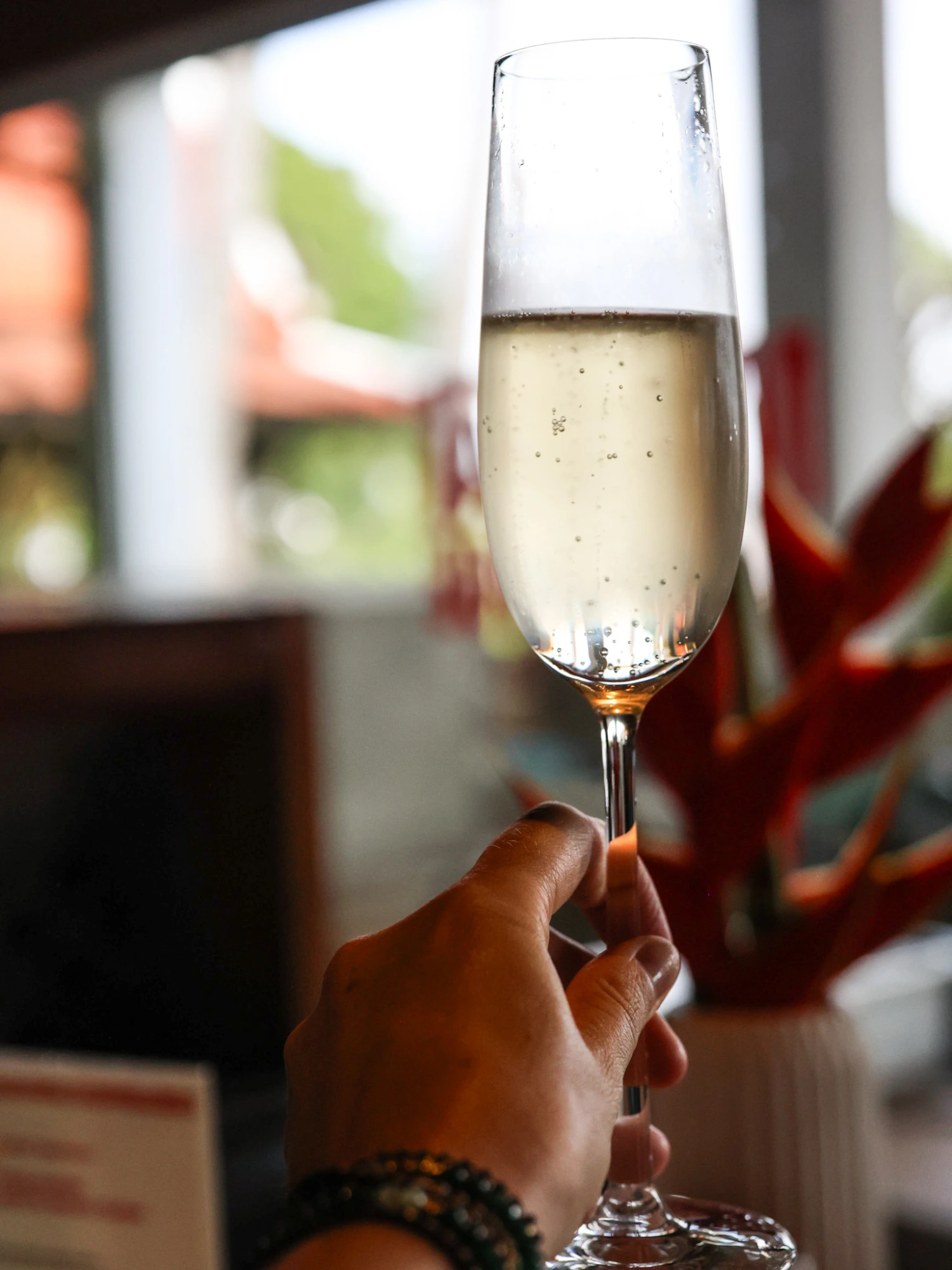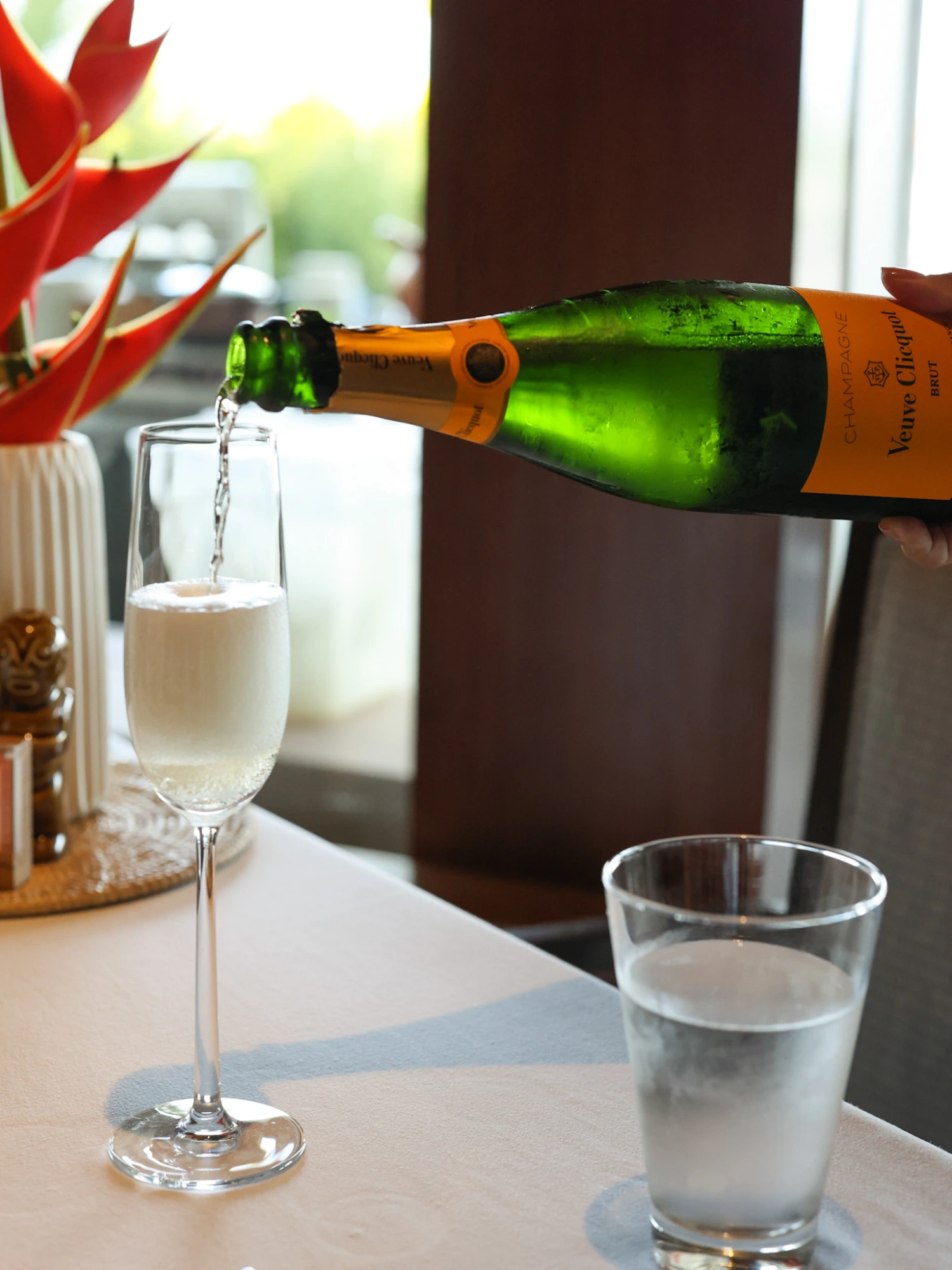 Meidät kutsuttiin nauttimaan shampanjabrunssia Trader Vic’siin, ja ajateltiin ensin että kyseessä on amerikkalainen shampanja, eli kuohuviini, mutta suureksi yllätykseksemme meille tuotiin legendaarista keltaista leskeä, eli Veuve Cliquotia, pöytään.