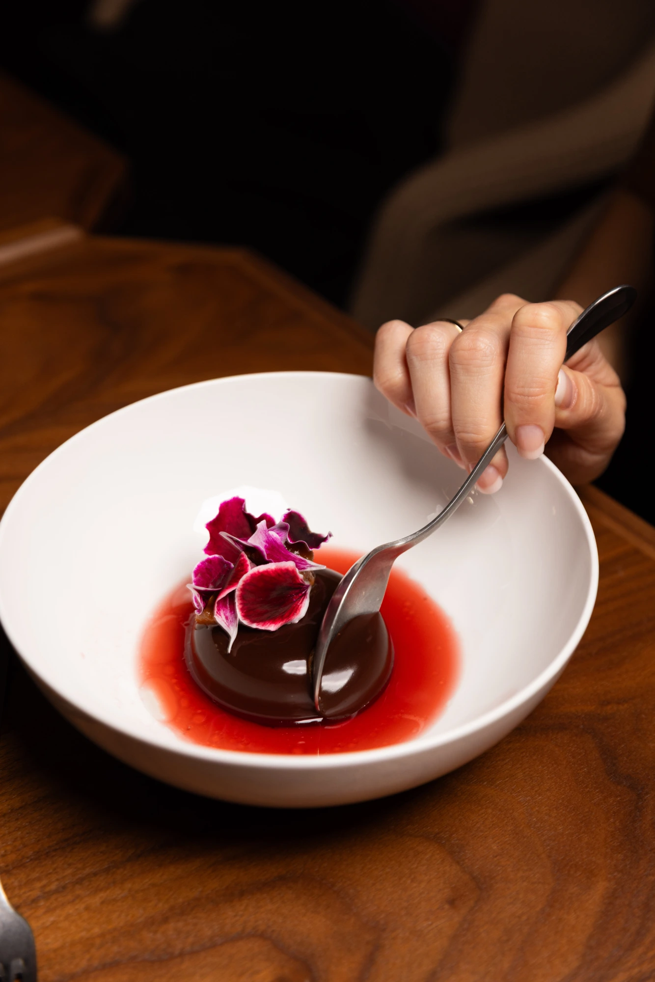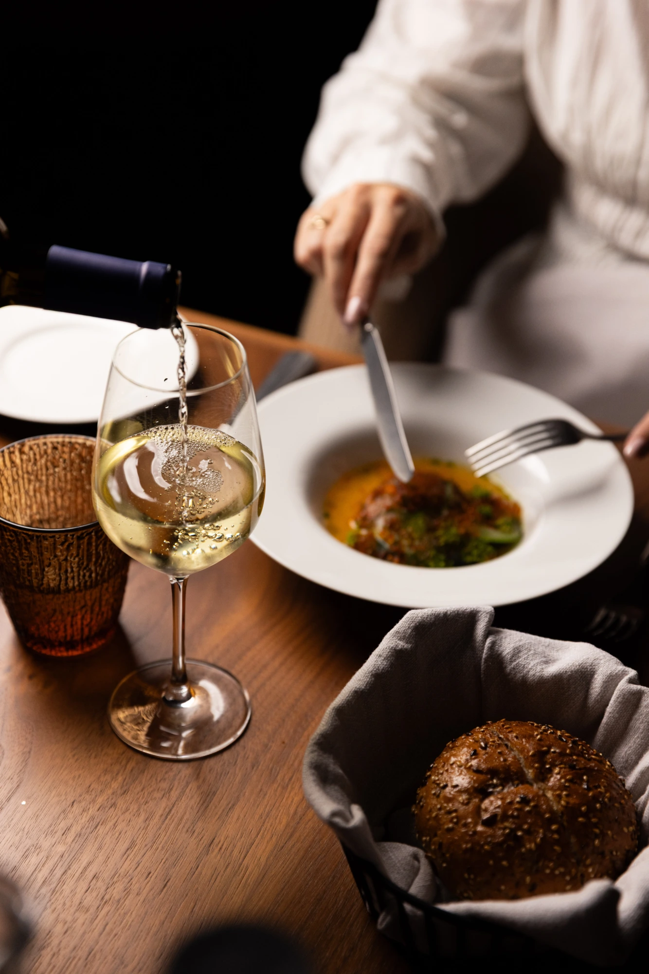 Baarin puolelle voi piipahtaa lasilliselle ja tilata keittiöstä annoksia fiiliksen mukaan. Sama ajatus ohjaa koko taloa. Laatu, selkeys ja makujen tasapaino näkyvät sekä lasissa että lautasella.