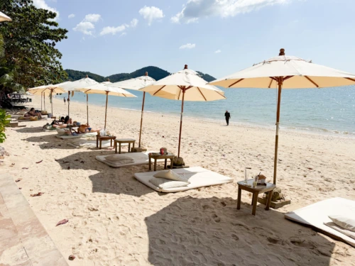 Phuketissa käsittääkseni kaikki rannat ovat julkisia, joten tässä ei voi suoranaisesti puhua omasta rantaviivasta, mutta eipä hotellin edustalla näyttänyt olevan paljon muita kuin asukkaita. Aurinkotuoleja löytyi tarpeeksi ja ne olivat todella mukavia ja kuuluivat luonnollisesti huoneen hintaan. Aurinkotuoleihin ei paistanut aurinko suoraan, joten monet valitsivat rentoutua rannan puolella omilla pyyhkeillään, jotka henkilökunta avuliaasti kävi asettelemassa