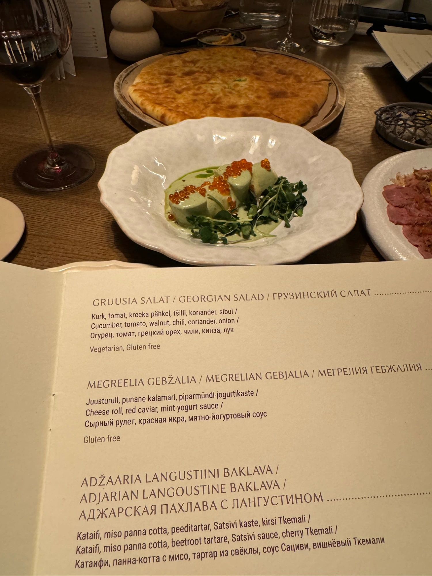 Kierroksen jälkeen meidät ohjattiin pöytään ja aloimme tutustua ruokalistaan. Gobin moderni sisustus on täynnä upeita yksityiskohtia, jotka vetävät katseen puoleensa niin vahvasti, että listaan keskittyminen oli meille alkuun hieman haastavaa. Olemme Tiinan kanssa todellisia tunnelman fiilistelijöitä ja aistimme ympäristöämme joka solulla. Onneksi henkilökunta ohjasi meitä lempeästi oikeiden valintojen äärelle ja ja siirsi huomion täydellisesti siihen, mitä olimme vasta aloittamassa: georgialaiseen illalliseen modernilla twistillä.