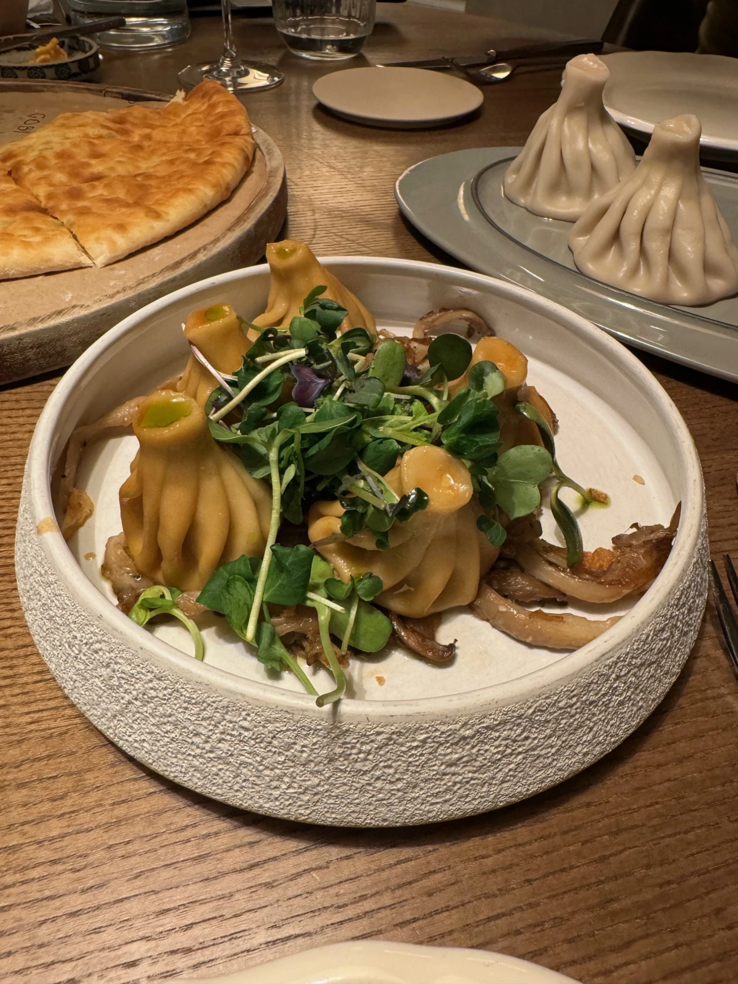Pääruoaksi söimme sekä minikhinkalit että suuremmat khinkalit. Miniversiot olivat kevyempiä ja sopivat erinomaisesti maisteluun, kun taas suuret khinkalit tarjosivat perinteisen, mehevän ja syvänmakuisen elämyksen. Tiina omaksui khinkalien syöntitekniikan hetkessä, ja voin kertoa, että tämän kierroksen jälkeen olimme molemmat enemmän kuin kylläisiä.