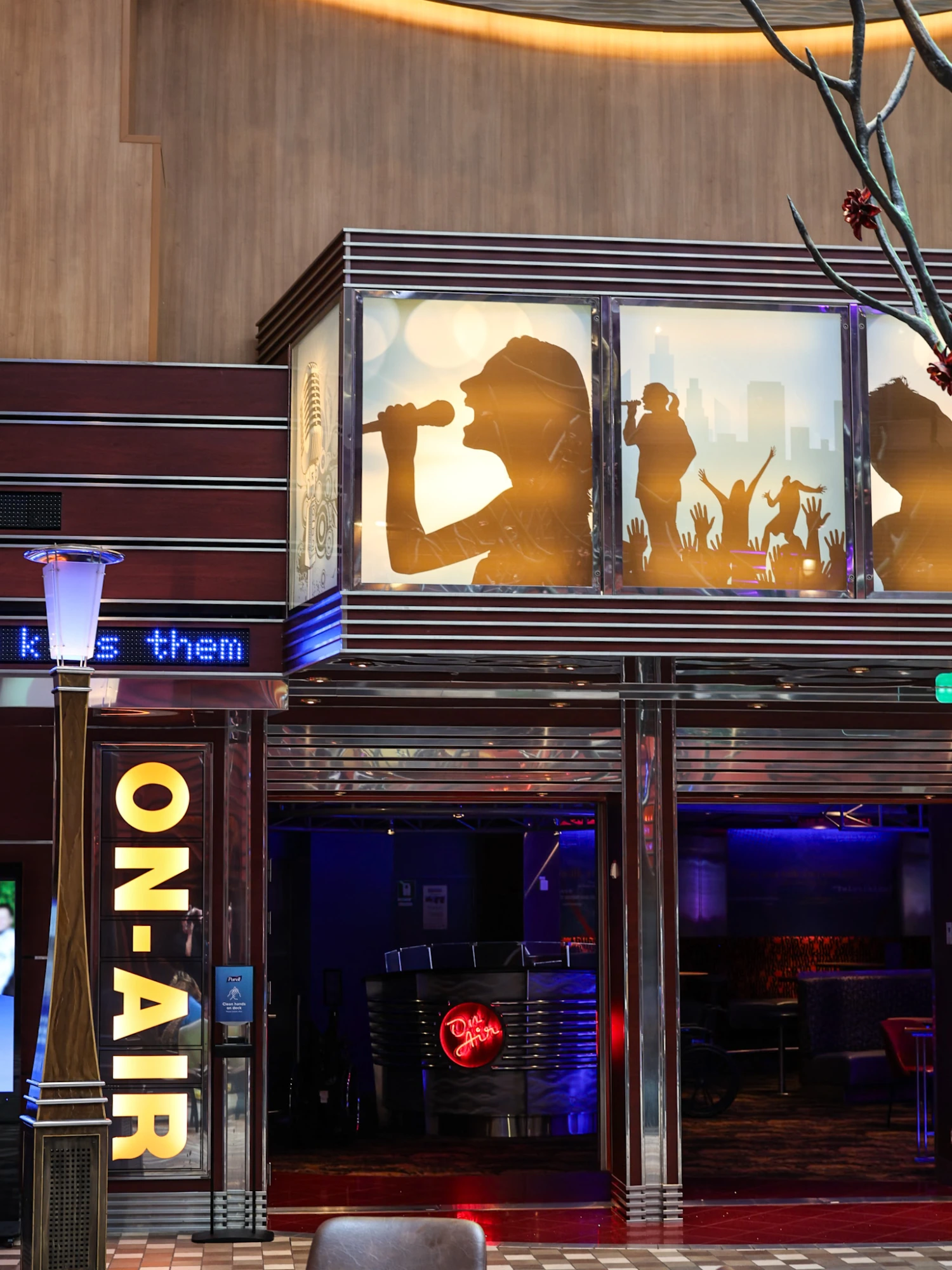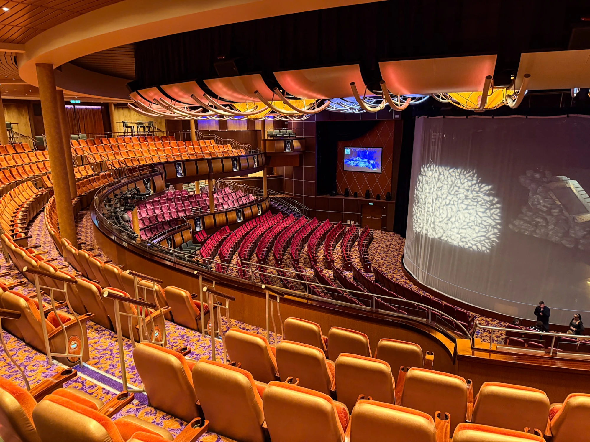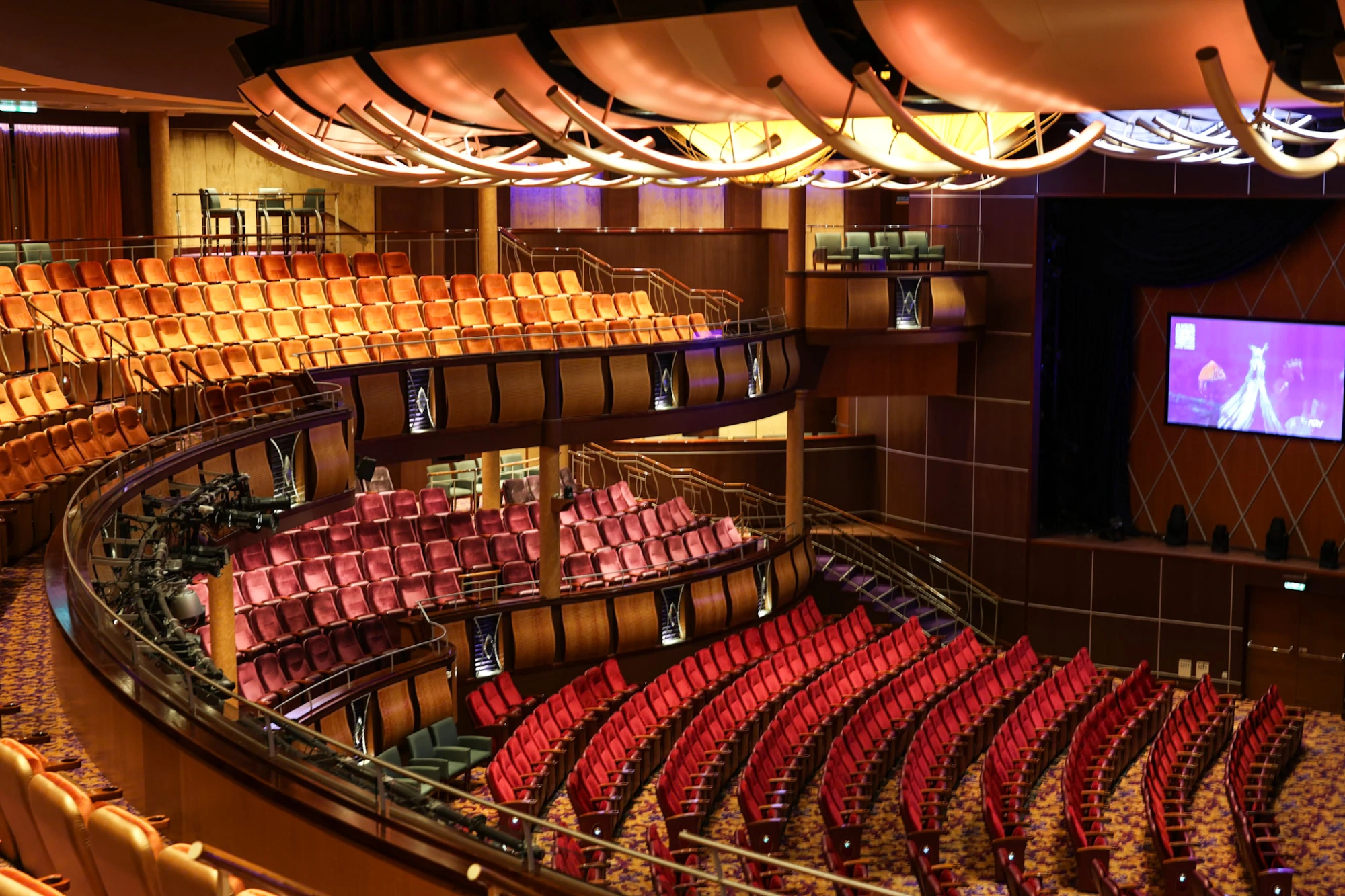 Laivalla järjestettiin myös sisätiloissa esityksiä joka päivä. Ohjelmistossa oli sekä täysimittainen Broadwayn Mamma Mia -musikaali että laivan oma show-tuotanto. Lisäksi alakansilla esitettiin stand up -komediaa laivan omassa komediateatterissa. Ja karaoken ystäville iloinen yllätys: laivalta löytyi myös kokonaan oma karaokebaari!