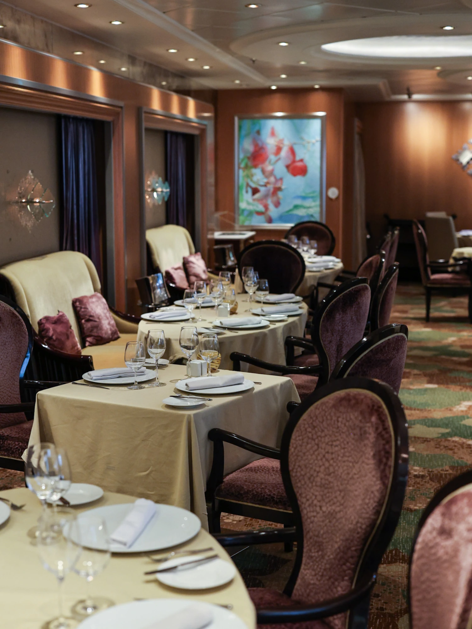 Risteilyn hintaan sisältyy jo valmiiksi laadukkaita ravintoloita, mutta jos haluaa panostaa ruokailuun erityisesti, muutaman erikoisillallispaketin hankkiminen on hyvä idea. Paketit ovat edullisempia etukäteen ostettuina, ja sovelluksen kautta varatut illalliset saa ilman veroja ja palvelumaksuja. Satunnaisia tarjouksia voi toki tulla vastaan myös laivalla, jos jokin erikoisravintola on myynyt huonosti sinä iltana, mutta tähän ei kannata luottaa. Lähtökohtaisesti kaikki kannattaa ostaa etukäteen: erikoisillallisten lisäksi juomapaketti ja erityisesti wifi ovat merkittävästi kalliimpia, jos ne hankkii vasta laivalta.