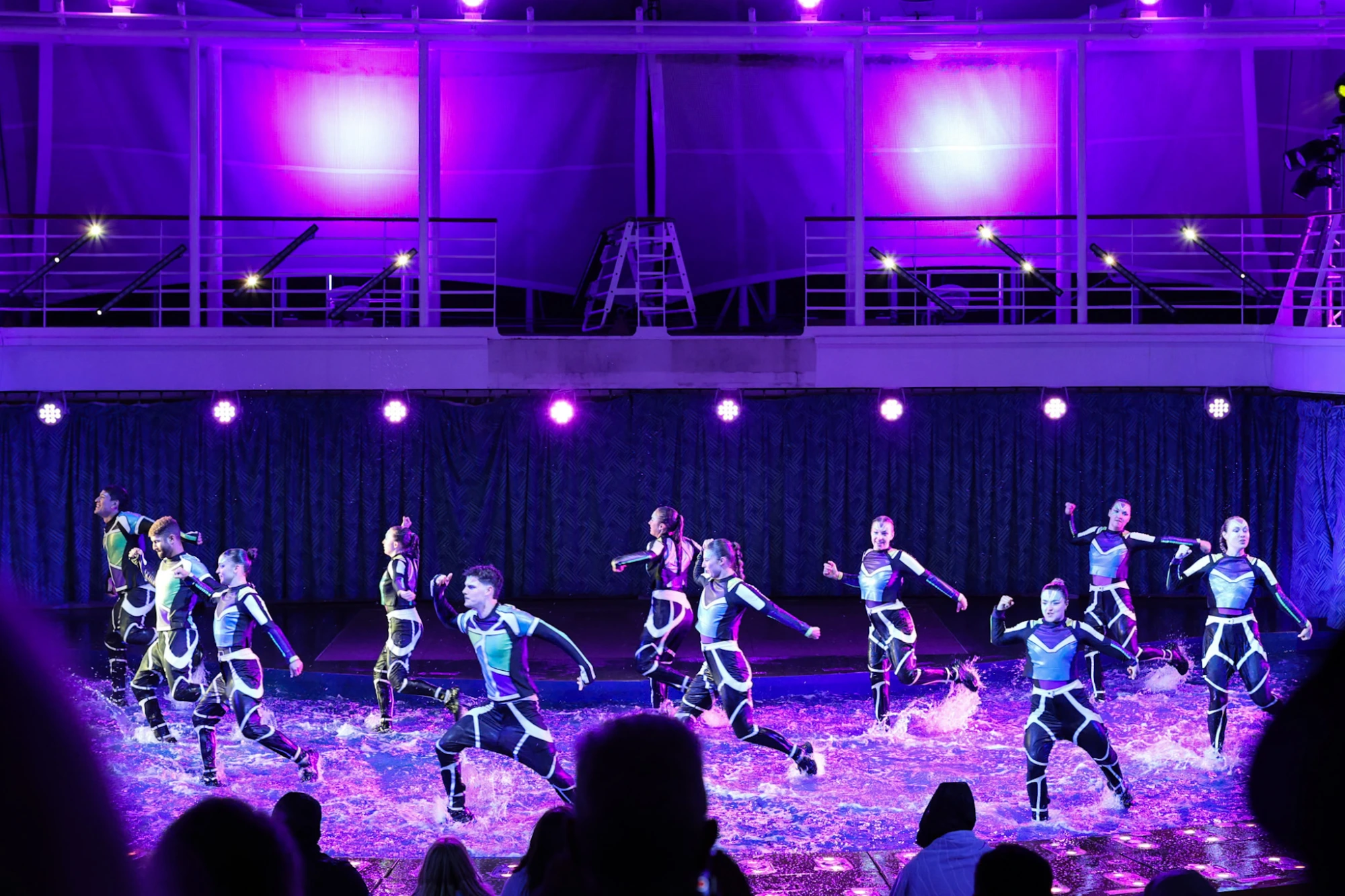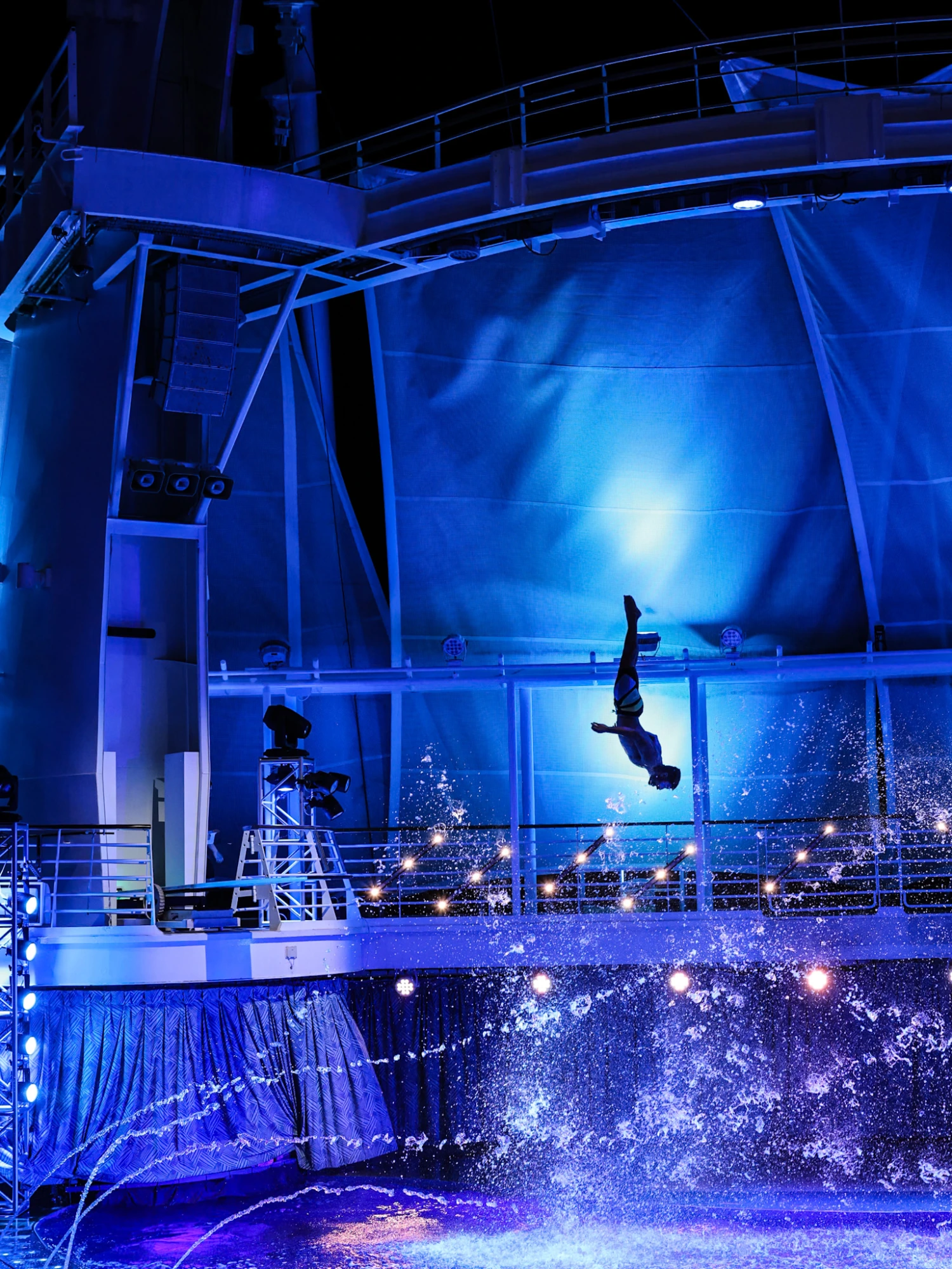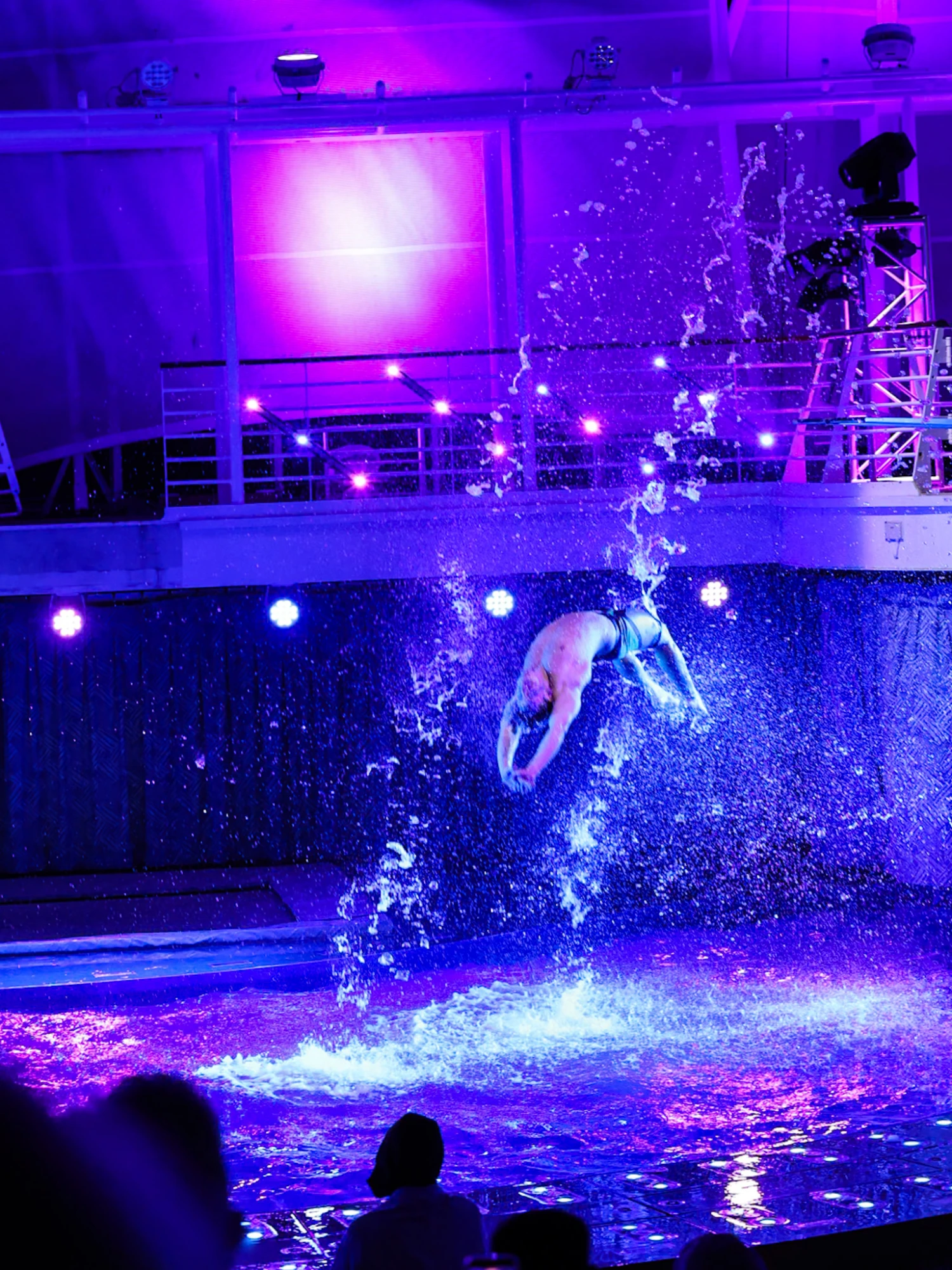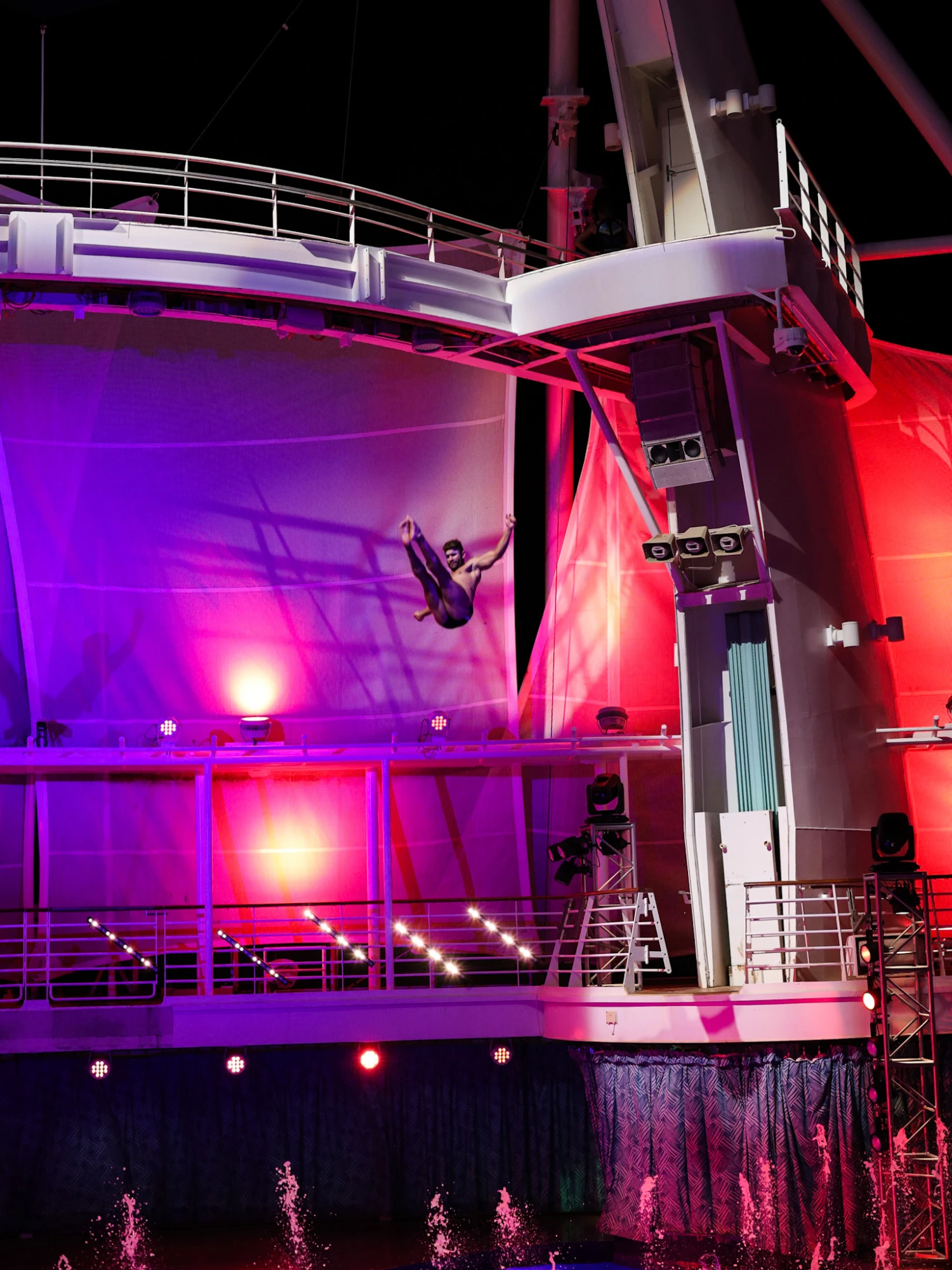 Ja nyt tulee seuraava käsittämätön asia. Laivan perässä oli myös ulko-allas ja 15-metrinen hyppytorni, josta esitettiin myös oma show – tällä kertaa entisillä olympiatason uimahyppelijöillä. Siis wau!