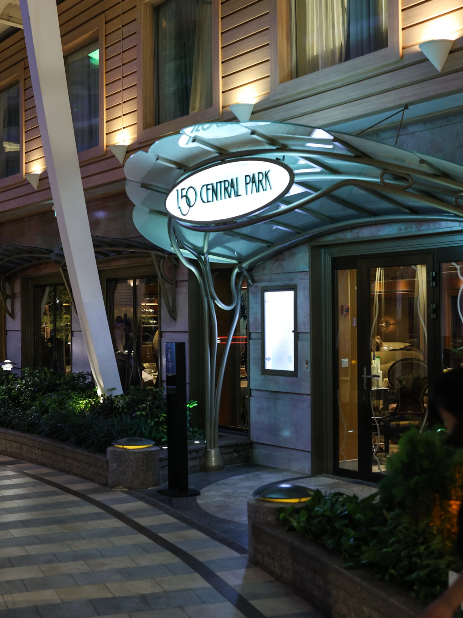 Toisena iltana illallistimme 150 Central Avenuessa, joka nousi omaksi suosikkiravintolakseni. Ravintola on poikkeuksellisen tyylikkäästi sisustettu ja koko laivan elegantein kokonaisuus. Sen nimi tulee sijainnista: ravintola sijaitsee keskellä Central Park -kävelykatua.