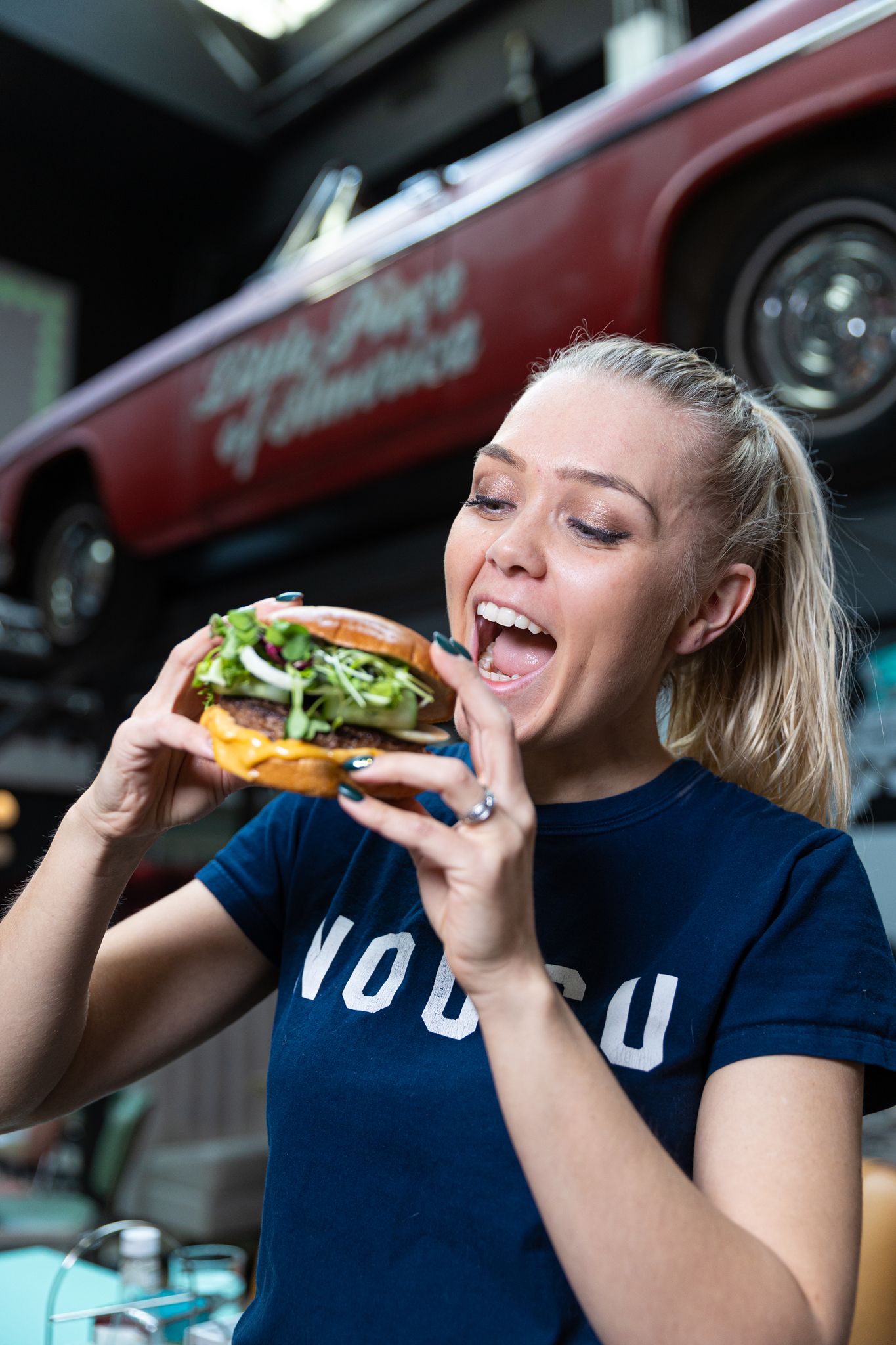Jo ovelta avautuva näkymä pysäyttää. 15 metriä korkeaan entiseen pankkisaliin rakennettu ravintola kätkee sisäänsä aitoja autoja ja moottoripyöriä, neonvaloja, krominkiiltoa ja hyvän mielen nostalgiaa. Tunnelma on yhtä aikaa näyttävä ja lämmin – kuin olisi hypännyt suoraan elokuvan lavasteisiin, joissa kaikki yksityiskohdat on mietitty tarkasti.